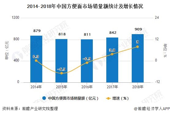 拉面说创始人姚启迪曾算过一笔账,目前国内每年人均消耗方便面35包,在这方面日本是48包,而韩国更是高达78包,由此可见中国市场空间依然很大。不过在外卖平台冲击之下,2013年起方便面市场出现严重下滑,状况持续到2018年才开始明显回升,到2019年有望恢复到2014年的水平。