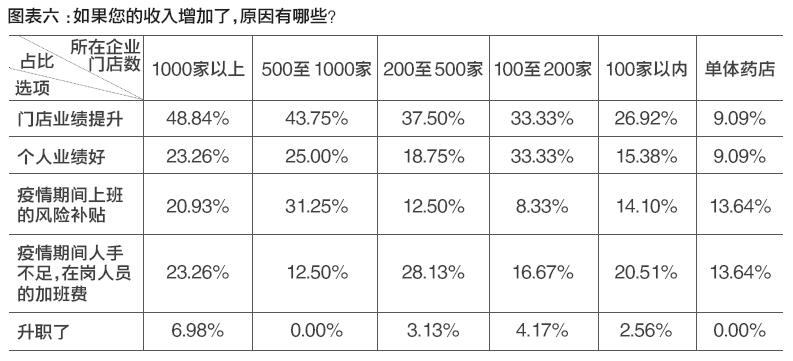 面对突然出现的收入变动,药店从业人员的心态并不一样。大企业里门店数量超过1000家的员工,差不多七成对降薪表现出强烈的不满情绪,觉得自己冒着风险去上班却进而得到降薪是很不合情理的。然而中小企业的员工相对来讲比较理性,将近八成表示理解公司所面临的困难。