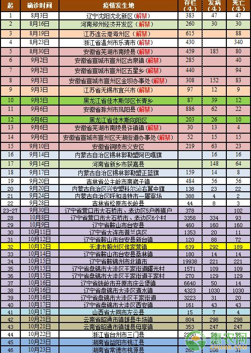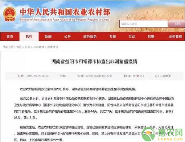 由湖南省动物疫病预防控制中心送检的样品,于10月22日被正式确诊为非洲猪瘟呈阳性。存在问题的两个养殖场,其中一个位于益阳市桃江县,另一个在常德市桃源县。桃江的那个场子,存栏猪有546头,发病的猪只数为44头,死掉的猪有17头;桃源的那个场子情况更为严重,存栏猪268头之中,发病猪有208头,死掉的猪达到31头。此乃湖南首次出现非洲猪瘟,当地政府已然启动应急机制。