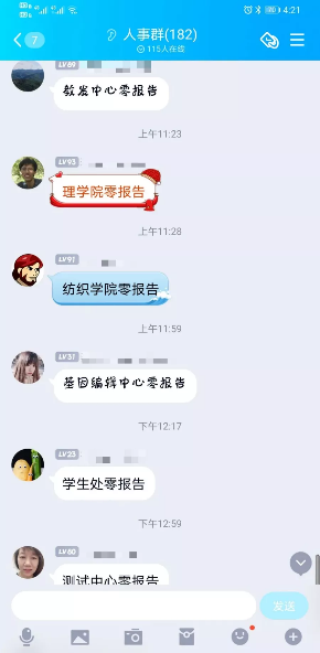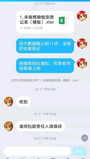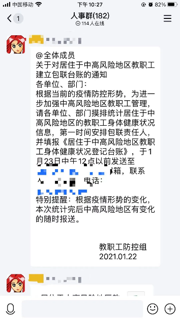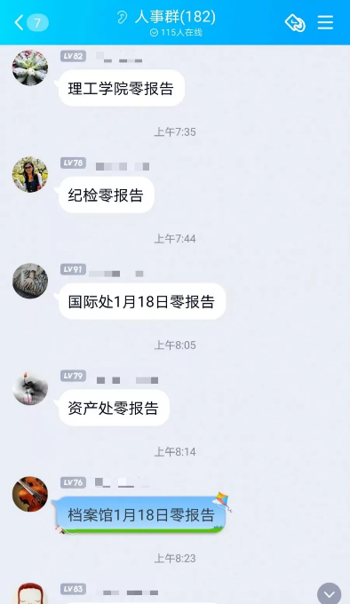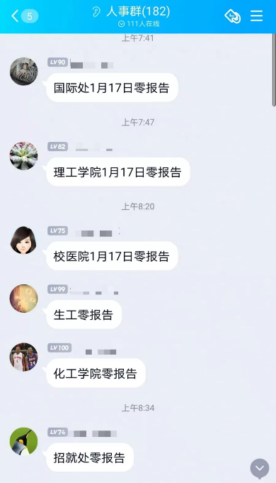 各单位那批联络员,才是真正撑起这些工作的人。他们之中,有的身为办公室主任,有的只是普通教师。自2020年1月起,便从未间断过。每天一大清早,群里就开始接龙汇报情况。哪个学院呈零报告,谁外出了,谁又回来了。一条条信息,全都汇总到朱重悦老师那儿。