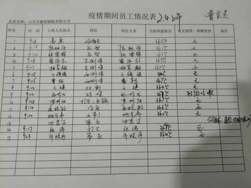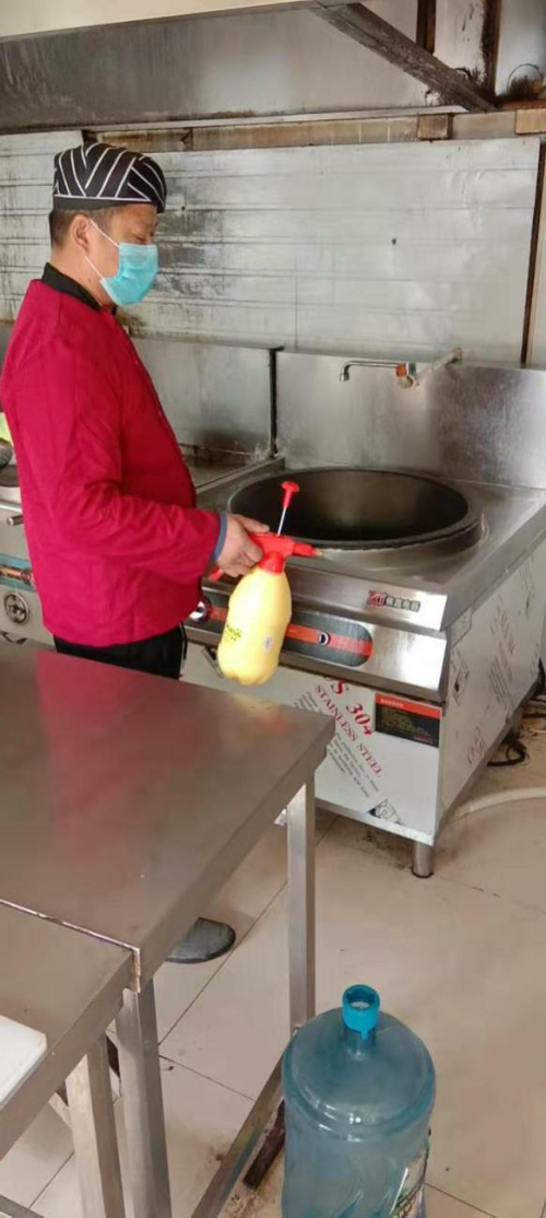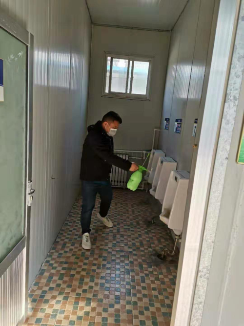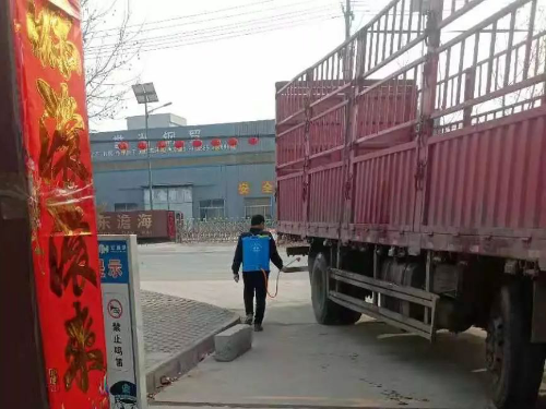 在山东宏鑫源,工会主席曹红力组建了一支疫情防控职工小组,他们每日对车间进行全面消毒,对职工宿舍进行全面消毒,对餐厅进行全面消毒,对厂区进行全面消毒,尤其针对电梯、洗手间这些易出问题之处,放置了一次性按钮纸巾以及酒精消毒液。