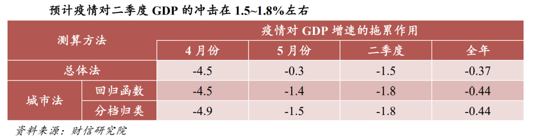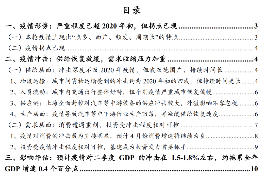 采用两种方式进行交叉验证,其结论大体能够对应得上。总体法是将百城拥堵指数代入回归方程,城市法则是逐个去估算上海、吉林等重点地区的损失,之后按照GDP权重加以汇总。两种运算方法均指向二季度GDP为1.5%到1.8%的冲击,换算为全年的拖累大概就是0.4个百分点。倘若重点城市迟迟无法解除封锁,那么这个数字还有可能向上调整。