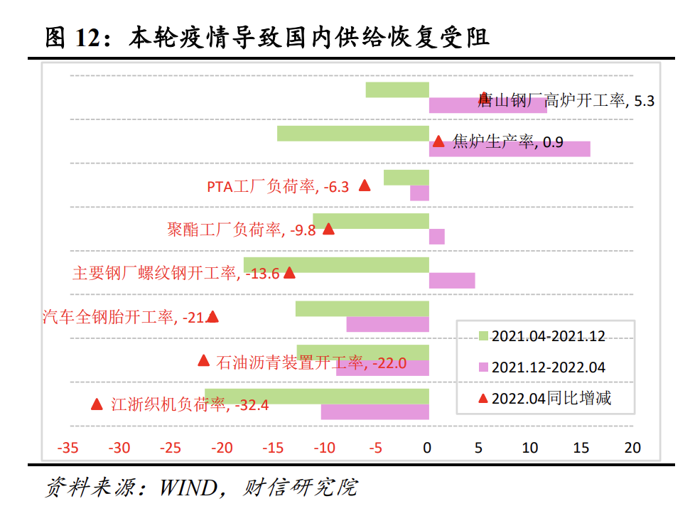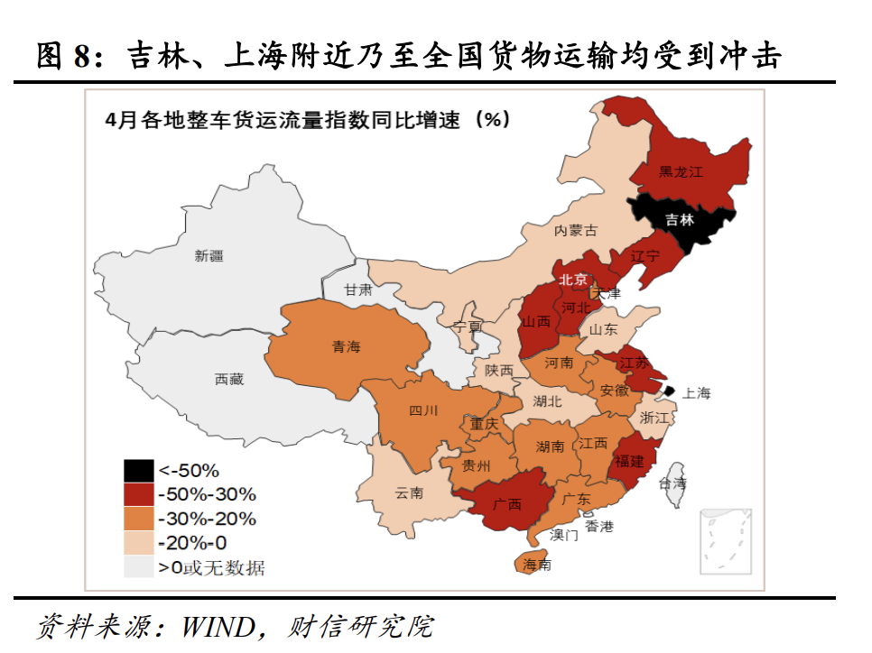 3月下旬起始,全国整车货物运输的恢复率出现变化,起初为91%,之后一路下滑,到4月份时降至大概65%左右,相较于去年同期,降低幅度在20到40个百分点之间。此同比降幅的均值为27.7%,这一数值大约是2020年疫情暴发之际最高降幅的四成。运输恢复率这一指标具备优势之处在于能够剔除季节性因素,也就是说降低的幅度确切反映了疫情对货物运输阻碍的程度。