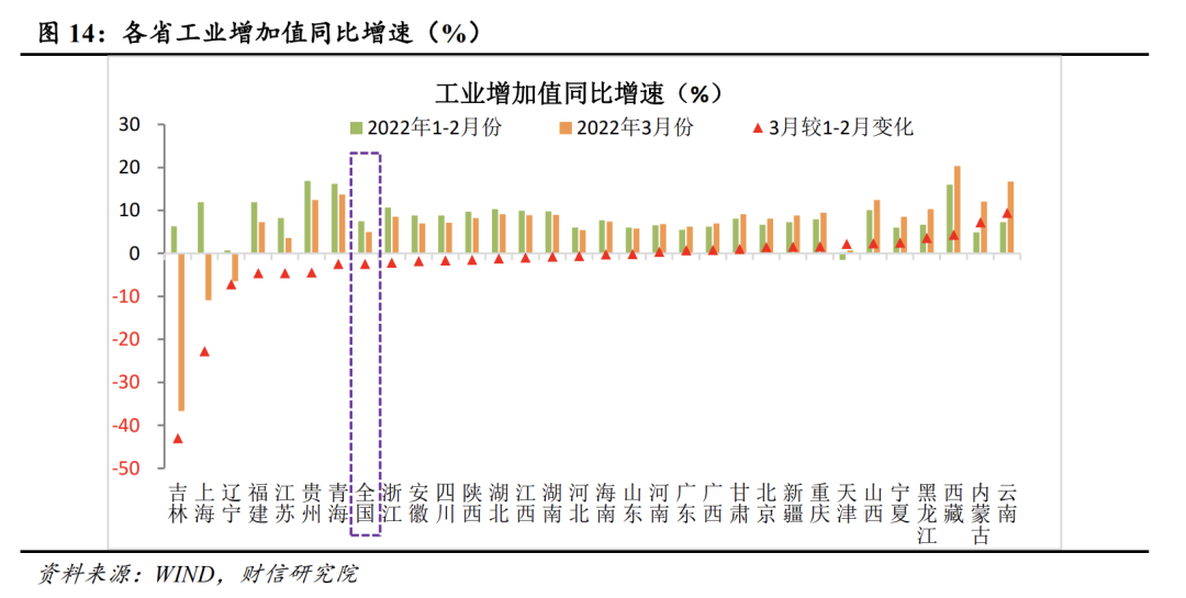 中下游集中了生产端的主要压力,汽车是最为典型的代表,上海、吉林是汽车制造重镇,零部件出不来,整车厂就得停线,这种影响层层沿着供应链传导,吉林暂停,长三角的配套厂也得减产,进而波及全国,31个省份里20个工业增加值增速环比回落,这不是局部问题。