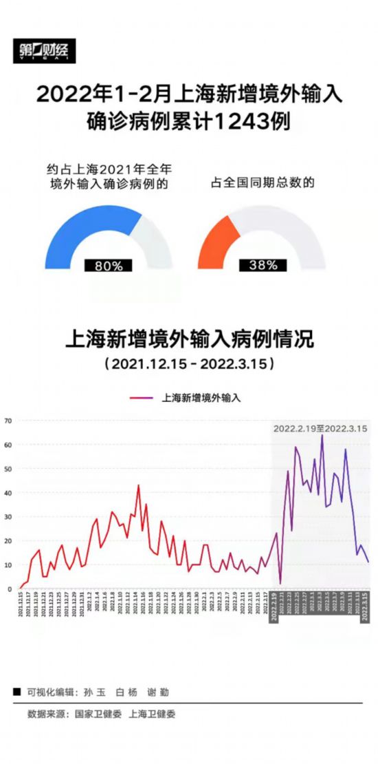 达1783例的上海境外输入病例中的确定诊断病例以及无症状感染者,是在2022年1月1日这个起始日期一直到3月15日这个截止时间期间出现的。仅仅是1月到2月,境外输入病例达到了1243例。这1243例的数量相当于2021年全年境外输入病例数量的80%。同时,它还占据了同期全国境外输入病例总量的38%。像这样高的数据,充分反映出上海所面临的境外输入风险是非常巨大的。