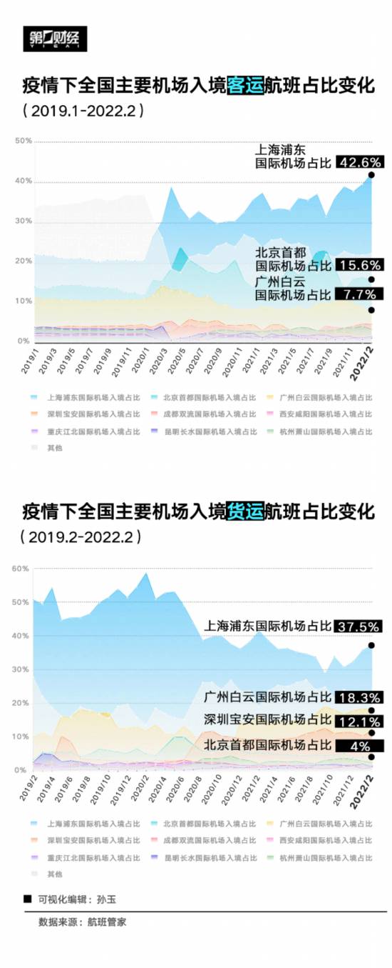 2021年,上海机场对我国近三分之一的出入境航班起落予以了保障,2020年疫情起始阶段,入境上海的国际航班数量是最多的,2021年上半年,浦东机场国际以及地区旅客吞吐量超过75万人次,相较于广州、北京和深圳三个机场的总数还要多出17万人次以上,2022年2月,上海浦东入境航班量在全国所占比例超过40%。