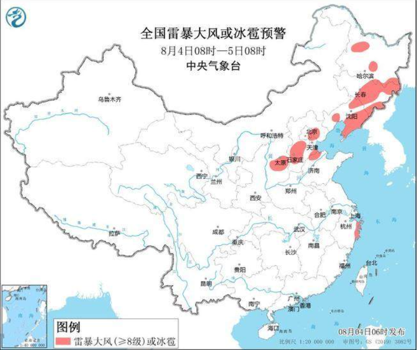 8月4日6时,中央气象台持续发布强对流天气黄色预警,预计从4日8时起至5日8时,黑龙江部分地区,吉林部分地区,辽宁部分地区,山西部分地区,河北部分地区,北京部分地区,天津部分地区,山东部分地区,浙江部分地区,将出现8到10级雷暴大风或者冰雹天气,局地风力甚至可能达到11至12级,并且存在出现龙卷的风险。