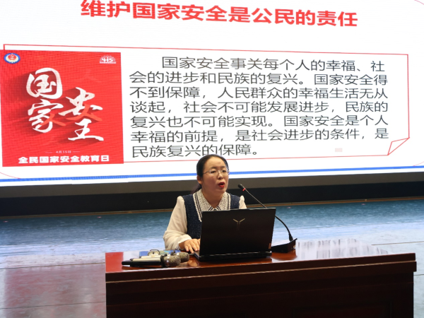 我院经验丰富的辅导员张瑾担任主讲人,她未照本宣科,而是从大学生身边典型案例切入,通过剖析网络交友、学术交流中可能存在的安全隐患,帮助同学们深入了解国家安全内涵,由此深化大家对总体国家安全观的认识,还与现场同学进行了热烈的交流互动。