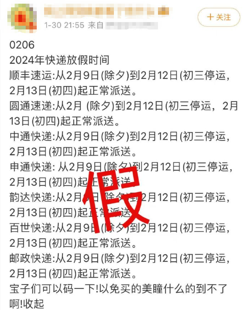 在朋友圈又一次大肆疯传的快递停运时间图映入眼帘之际,你是否会条件反射般地动手打开购物软件进而着手开始囤货呢?先别急着行动,请先去查看一下今年快递公司的实际真实安排,千万不要被那些毫无根据的谣言带偏原本正常的节奏。