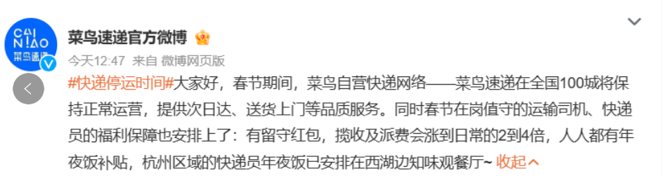 菜鸟速递的官方微博发布了一则消息,消息内容为之,在春节期间于全国100个城市维持正常运营,然后他们作出承诺,承诺会提供次日达以及送货上门这般的品质服务,而对于平常习惯网购的年货消费者来讲,这无疑是一个好消息。