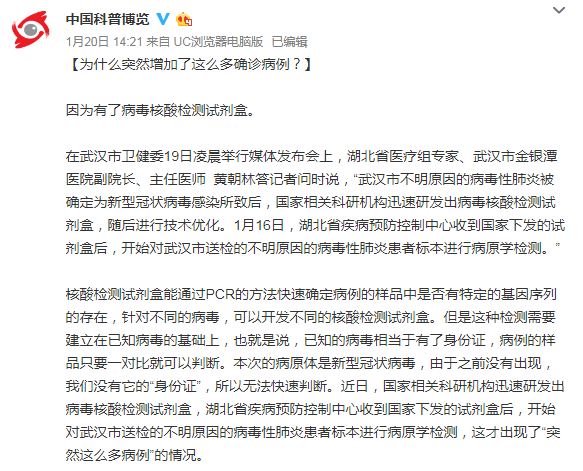 中国科普博览的微博证实了,是检测工具到位,才使得武汉送检的标本能够迅速被确诊,之前对于新发疾病的认知是需要过程的,现在两次呈现阳性就可确诊,所以在19日与20日这两天,武汉新增病例达到了136例,这种“暴发式”的通报实际上是排查能力得到提升的一种表现,使得疫情从隐匿状态走向了透明状态。
