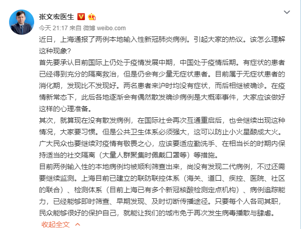 在二十一号的傍晚时分,上海疾控中心通报了两位从外地来到上海的无症状感染者,在当晚九点多的时候,张文宏发布微博表示,大家要做好“此后各地逐渐会有偶然散发确诊病例”这样的心理准备,这句话所表达的意思是,清零已然成为过去发生的情形,在今后类似的状况会隔三岔五地陆续出现,我们不再去追求零病例,而是致力于追求在发现病例之后能够迅速地实施控制,这种心态方面的转变相较于囤口罩而言显得更加紧迫,因为恐慌永远比病毒传播的速度更快。