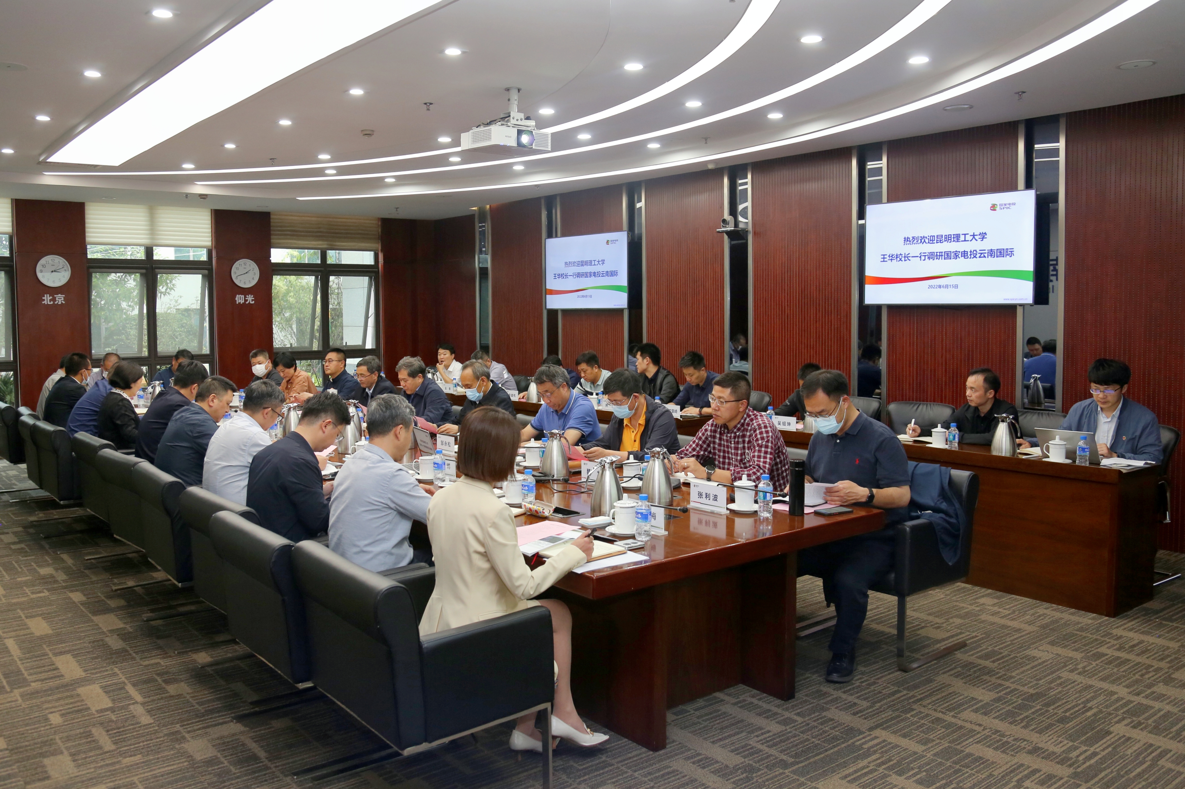 这次带队的是王华校长,带去了校办的相关负责人,带去了教务处的相关负责人,带去了研究生院的相关负责人,带去了资产实管处的相关负责人,带去了就业指导中心的相关负责人,带去了后保中心的相关负责人,带去了社区中心的相关负责人,带去了冶能学院的相关负责人,带去了电力学院的相关负责人。在2026年6月15日上午,这支十多人的队伍,先是参观了国电投云南国际的展示中心后,又参观了昆明新能源运营中心。