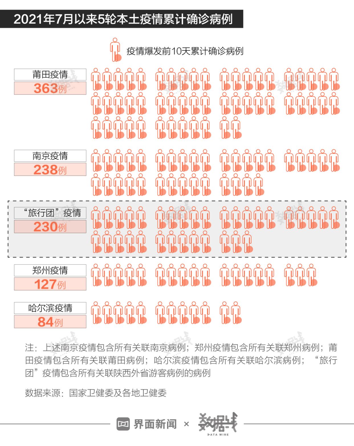 这一轮的疫情,和在此之前的四次,存在着一个显著的差异,并非是从单个地点突然爆发开来,而是由多个地点同时涌现出来。旅行团所构成的这条传播链条,将十几个省份串联在了一块儿,在短短10天的时间里,扩散至23个地方,其传播速度相较于南京、莆田那几轮而言,更为迅速。