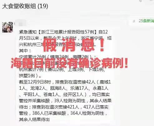 12月7日,有一张消息截图在四处流传,其内容是“杭州地铁一号线司机阳性,全体职工核酸”,杭州网记者经核实后确定这是谣言,还提醒大家防疫信息应以官方发布的为准。就在同一天,镇海区也传出了一种说法,即“因为疫情封区,汽油会短缺”,镇海新闻中心记者与中石化浙江石油宁波分公司取得联系,对方明确表示加油站营业一切正常,油品供应从来都没有中断过。