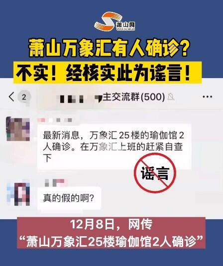 萧山近来同样是谣言的重灾之地,12月7日杭州通报两例确诊病例之后,网络上立刻就有人宣称萧山新增了四个中风险区域,实际上依据杭州发布的消息来看,仅仅是萧山区北干街道龙湖春江天玺17幢被调整为中风险,其余的都是编造出来的,8日又有传言称“萧山万象汇25楼瑜伽馆有2人确诊”,萧山网记者与万象汇以及街道工作人员进行一番核实,确定是假的。