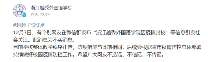 12月7日,有人员于微信群发布消息,称“浙江越秀外国语学院因疫情封校”,此情况致使不少家长产生担忧情绪。当晚,学校官方微博发布声明进行辟谣,表明教学秩序处于正常状态,防疫措施与之前保持一致,将会依据省市部署开展后续工作。9日上午,网络上又流传“慈溪观城中学发生疫情”,后续证实此消息同样为不实信息。