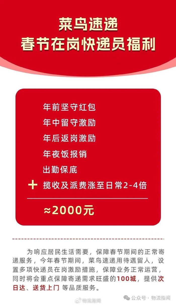 菜鸟速递于今年春节期间,在全国百城推出了次日达服务,还推出了送货上门服务。经测算,春节期间在岗的运输司机,以及快递员,通过各项福利激励,人均能够额外增收大概2000元,年夜饭费用也是可以报销的,凭借这样的待遇留住人员,保障了网络的稳定运营。